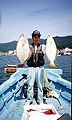 金華山・瀬戸のヒラメ釣りは一般的に知られていますが、今回は色々とポイントを探しながらボウズ覚悟で出船した。沖合で知り合い定置網より活きイワシを分けて貰い、サイズはヒラメに最高の大きさ、まず40mラインの砂地で竿を下ろした。20分後立て続けに75.3Bと73Bをゲット、船上は大騒ぎ船頭も慌てて直径70Bのタモを取り出し、無事取り込み一安心。その後何度かポイントを換えアタリはあるがバラシが多くなり、それでも63〜65Bの型揃いが4枚上がり3人で6枚の釣果でした。